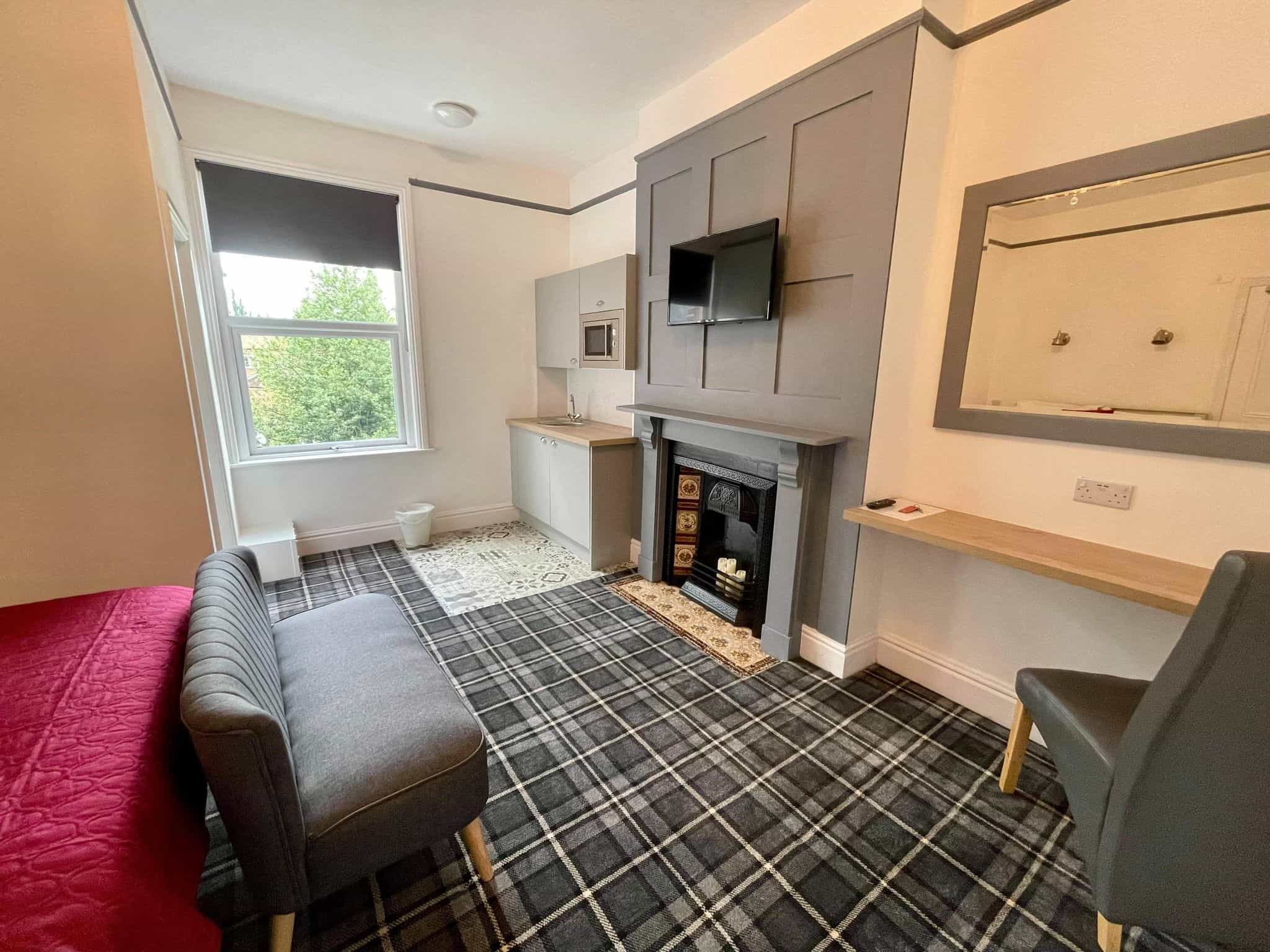 Beautifully refurbished studio room with kitchenette and shower room, situated on the ground or 1st floor at the rear of our guest house. This bright and airy room boasts a king size bed, large screen tv, fitted kitchenette with integrated fridge and microwave, toaster and kettle. Spacious en-suite shower room and desk/dressing area.